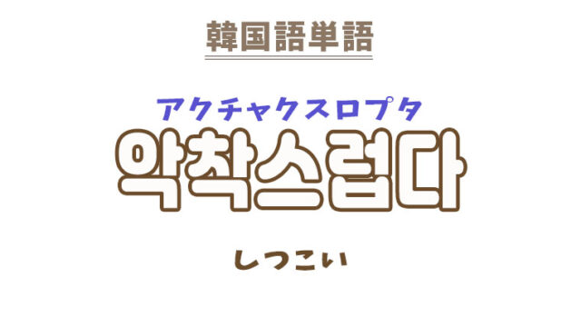 単語・慣用句 韓国語【악착스럽다】を覚える! 2026年2月6日 makumaku 악착스럽다アクチャクスロプタ しつこい〔形容詞〕 一緒に覚える! 【악착】:がむしゃら〔名詞〕 【악착스레】:粘り強く〔副詞〕 【악착스 …
