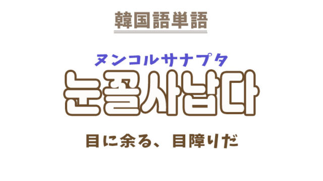 単語・慣用句 韓国語【눈꼴 사납다】を覚える! 2022年10月10日 makumaku 눈꼴 사납다ヌンコルサナプタ 目に余る、目障りだ〔形容詞〕 一緒に覚える! 【눈꼴】:目つき〔名詞〕 【사납다】:険しい〔形容詞〕 【눈 …