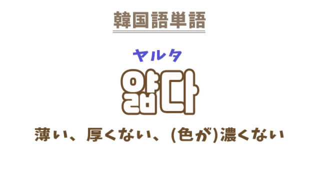 単語・慣用句 韓国語【얇다】を覚える! 2022年6月14日 makumaku 얇다ヤルタ 薄い、厚くない、(色が)濃くない〔形容詞〕 一緒に覚える! 【얇디얇다】:非常に薄い〔形容詞〕 【얇아지다】:薄くなる〔動詞〕 【얇히다 …