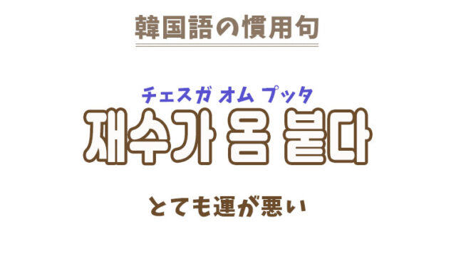 単語・慣用句 「재수가 옴 붙다」の意味は?【韓国語の慣用句】 2023年12月4日 makumaku 재수가チェスガ 옴オム 붙다プッタ とても運が悪い直訳:財運に皮癬が付いた 一緒に覚える! 【붙다】:付く〔動詞〕 …