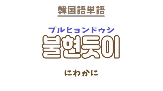 単語・慣用句 韓国語【불현듯이】を覚える! 2022年11月8日 makumaku 불현듯이プルヒョンドゥシ にわかに〔副詞〕 【불현듯이】の解説 【불현듯이】の日本語訳。 にわかに、いきなり、突然、出し抜けに、ふと ※縮 …