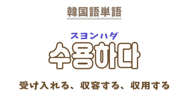 単語・慣用句 韓国語【수용하다】を覚える! 2023年9月1日 makumaku 수용하다スヨンハダ 受け入れる、収容する、収用する〔動詞〕 【수용하다】の解説 【수용하다】の日本語訳 受け入れる、受容する 収容する …