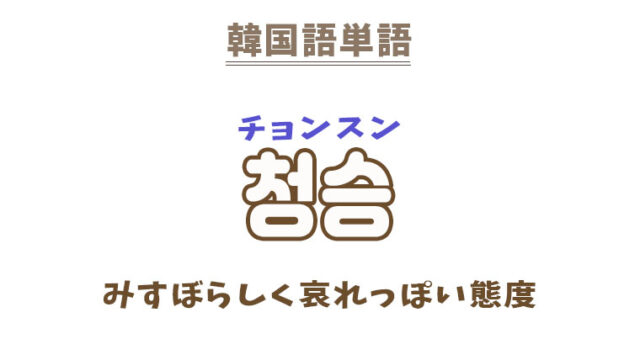 単語・慣用句 韓国語【청승】を覚える! 2023年5月3日 makumaku 청승チョンスン みすぼらしく哀れっぽい態度〔名詞〕 一緒に覚える! 【청승궂다】:見苦しい〔形容詞〕 【청승맞다】:いかにも物悲しい〔形容詞〕 【청 …