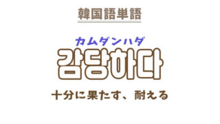 単語・慣用句 韓国語【감당】を覚える! makumaku 2022年10月10日 / 2023年4月24日 감당カムダン 十分に果たすこと〔名詞〕 一緒に覚える! 【감당되다】:耐えられる〔動詞〕 【감당하다】:耐える〔動詞〕 Contents 【감당】の解説【감당:十分に果たすこと】【감당:十分に果たすこと】の類義語【감당:十分に果たすこと】を使った例文【감당】の解説 【감당】の日本語訳。 十分に果たすこと、上手くやり遂げること 【감당:十分に果たすこと】 【감당:十分に果たすこと】の類義語 감내:忍耐〔名詞〕 인내:忍耐〔名詞〕 처리:処理〔名詞〕 【감당:十分に果たすこと】を使った例文 名詞